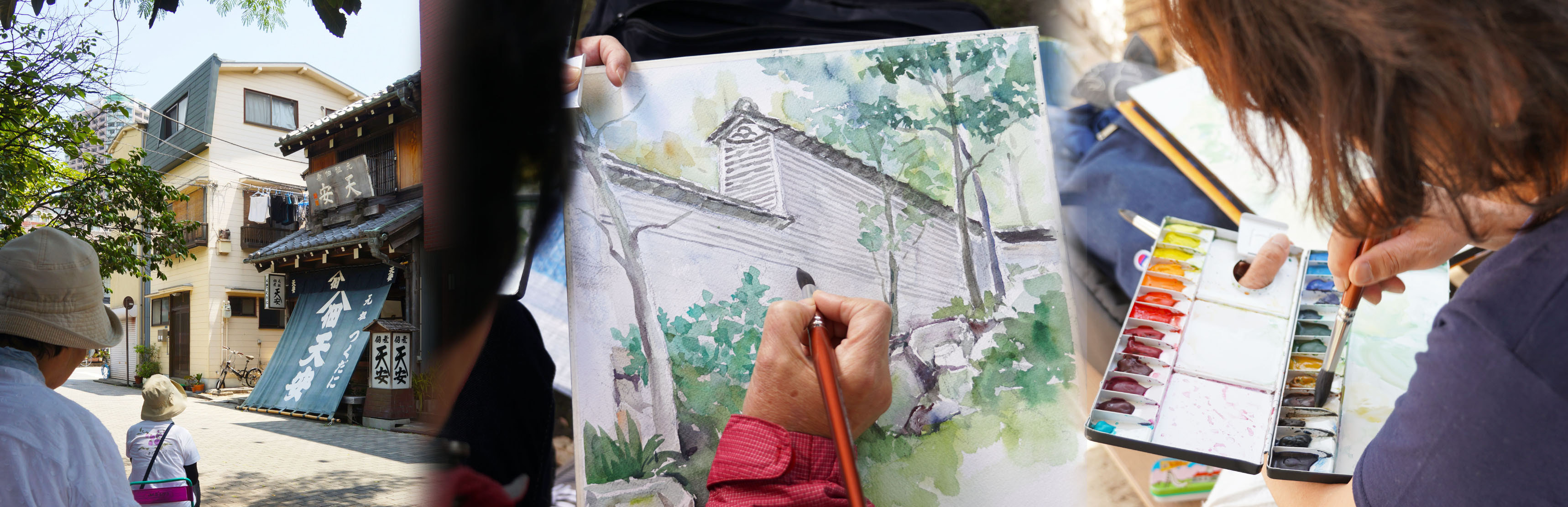 風景スケッチでは、都内近郊の公園や庭園をはじめ、絵になる街並みや史跡など様々な場所でスケッチを行います。