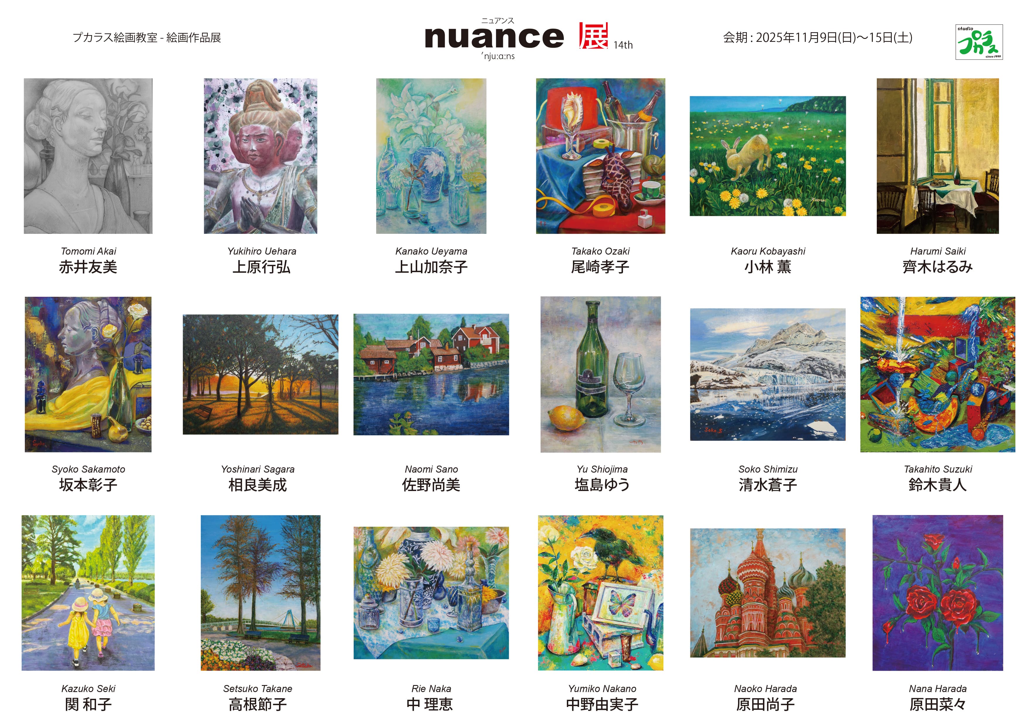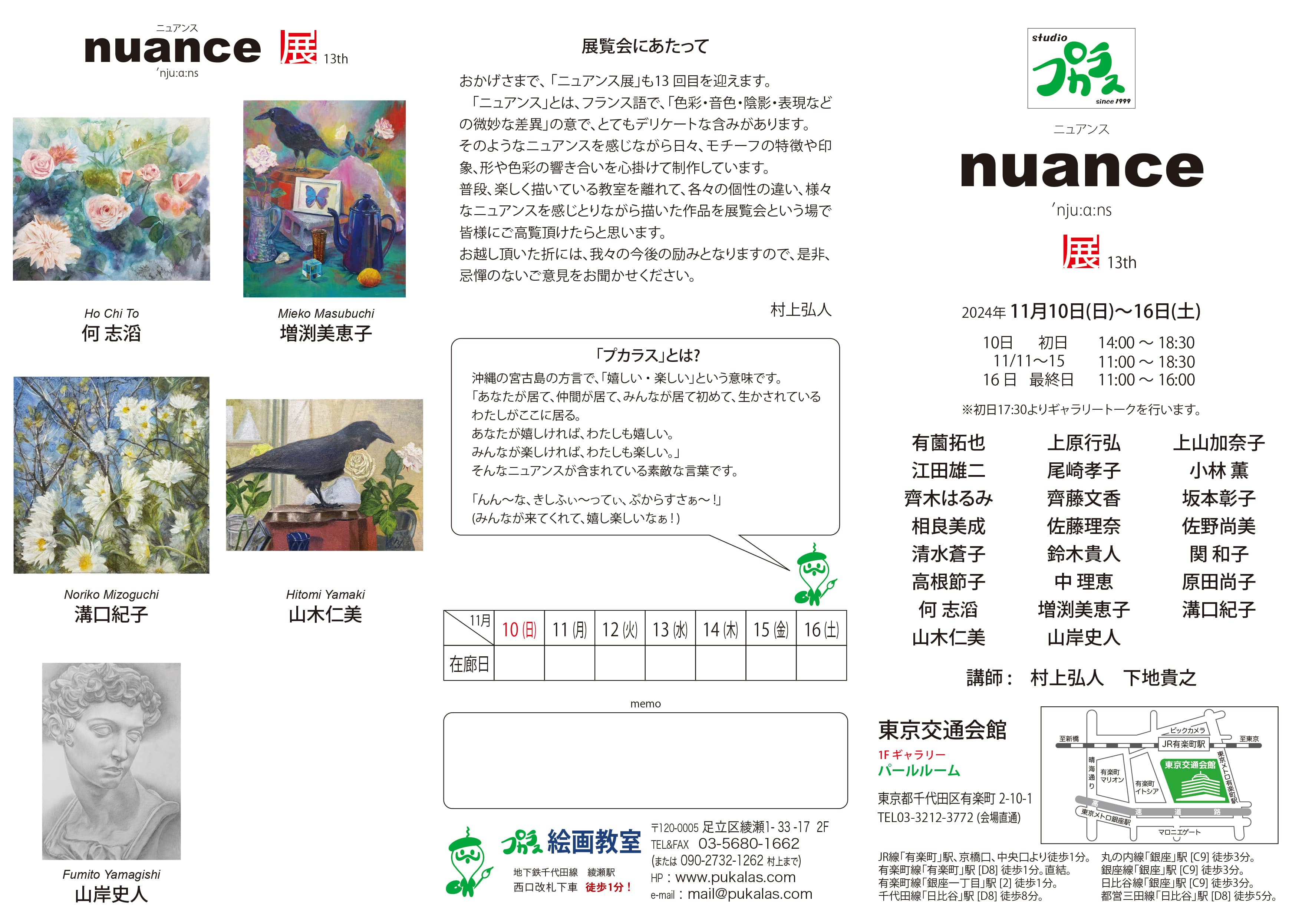 毎秋にプカラス絵画教室の有志で「ニュアンス展」という展覧会を2012年から銀座界隈のギャラリーで開催しております。制作するだけでなく、作品を展示し観覧していただくと、様々な意見や感想を聞くことが出来ます。また自分では気づかなかった点や作品を通してのコミュニケーションなど大変勉強になります。展覧会にご家族やお友達、知人をお誘いしてご歓談ください。