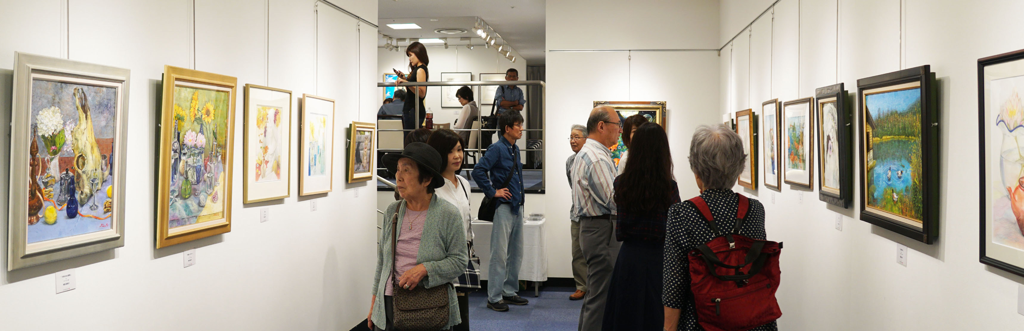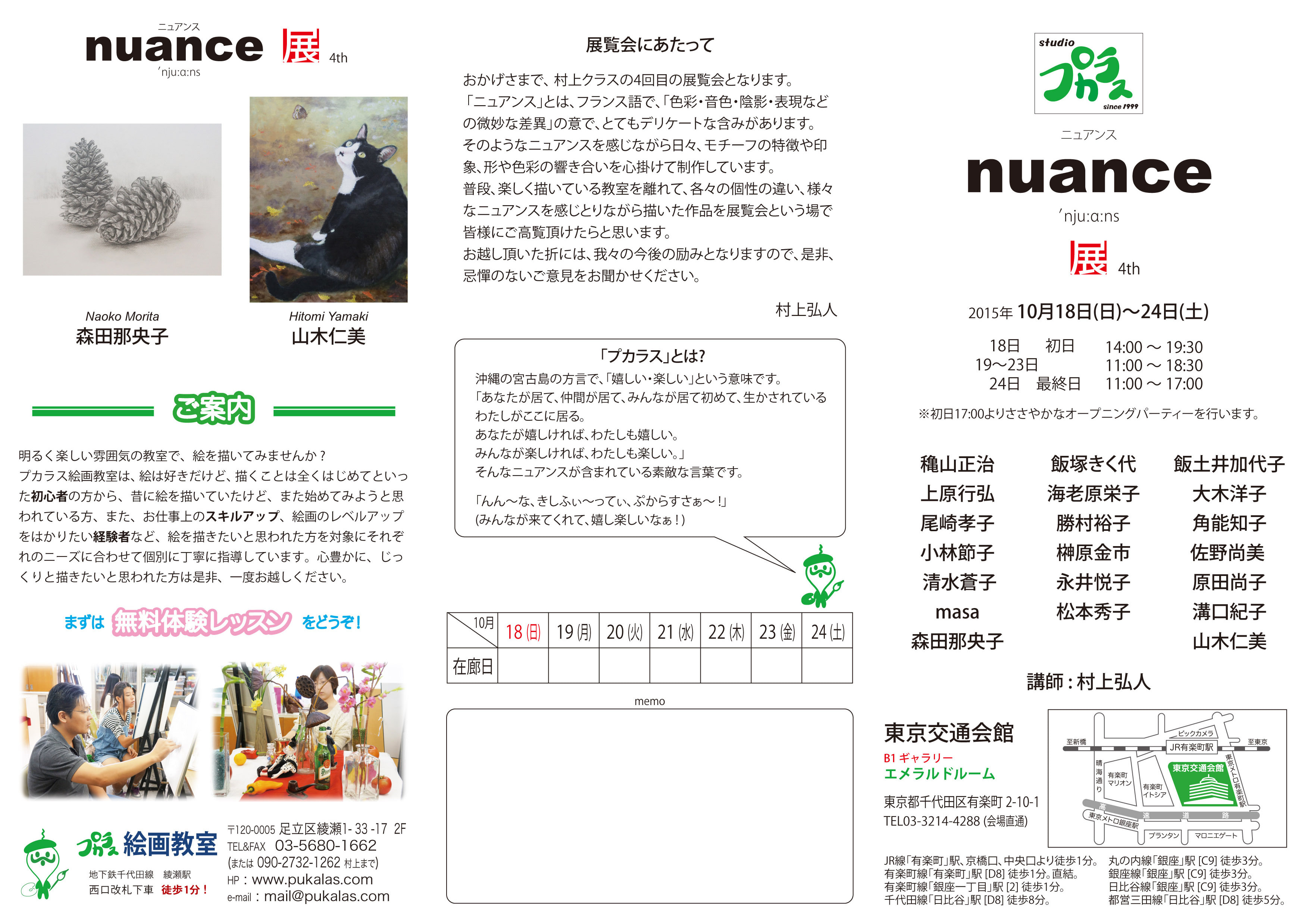 毎秋にプカラス絵画教室の有志で「ニュアンス展」という展覧会を2012年から銀座界隈のギャラリーで開催しております。制作するだけでなく、作品を展示し観覧していただくと、様々な意見や感想を聞くことが出来ます。また自分では気づかなかった点や作品を通してのコミュニケーションなど大変勉強になります。展覧会にご家族やお友達、知人をお誘いしてご歓談ください。